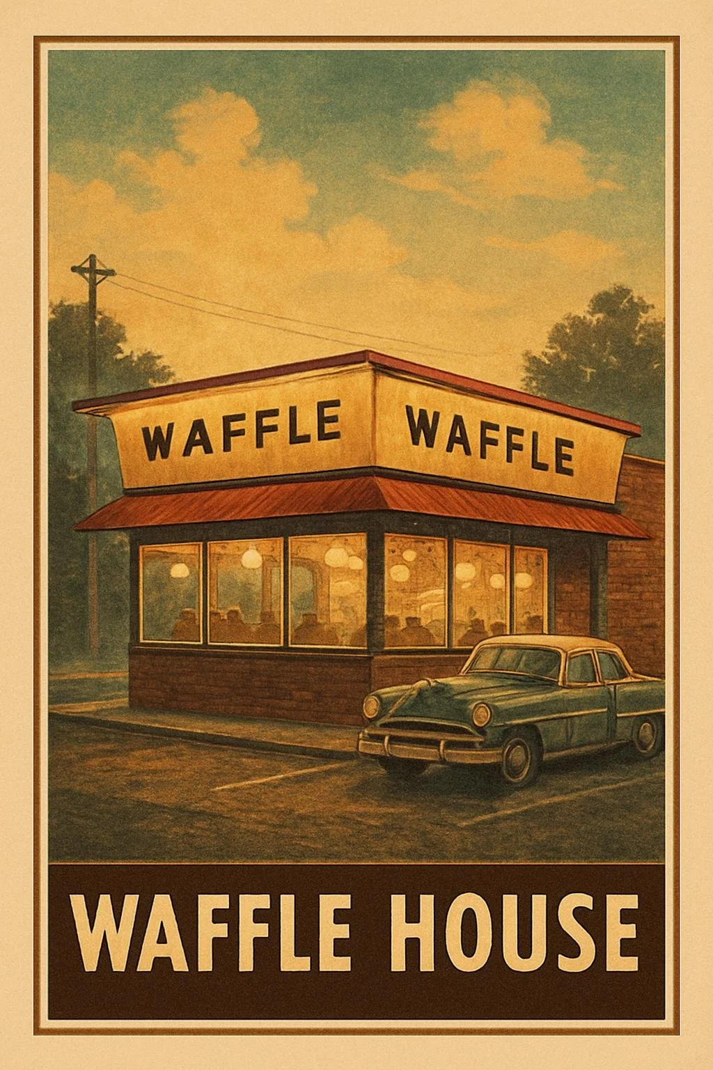 Pohsters › Waffle House Image 1 of 1 Waffle House from $20.00 A nostalgic, retro art print of a classic Waffle House restaurant with a vintage car parked outside. Size: Select Size 16" x 24" 24" x 36" Quantity: Add To Cart Added! A nostalgic, retro art print of a classic Waffle House restaurant with a vintage car parked outside.